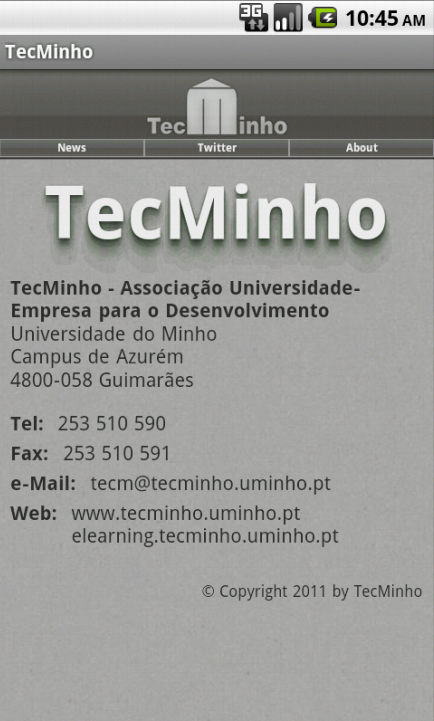 The TecMinho News application was developed with Appcelerator® Titanium SDK and displays the official company news, tweets and contacts. The news are fetched using a rss feed, so the application requires an active internet connection to view the news and tweets. The company contacts are available offline. In case of questions or bugs, please contact me. Bin (Company Site) |